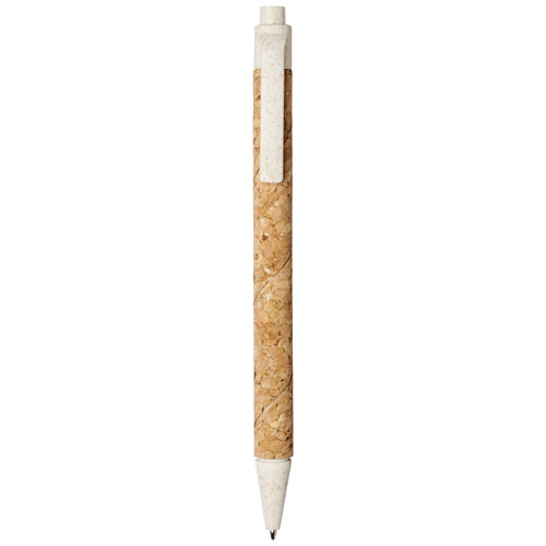 Ecovriendelijke balpen met klikmechanisme, met een huls van kurk en tarwestrostro in verschillende kleuren. Tarwestro blijft over na het oogsten van de tarwekorrels. Dit vermindert het gebruik van plastic, wat een milieuvriendelijk alternatief biedt. De kleur van het kurkmateriaal kan variëren.
