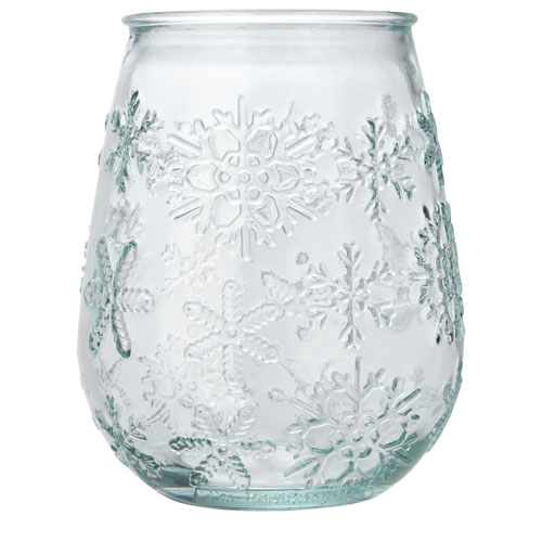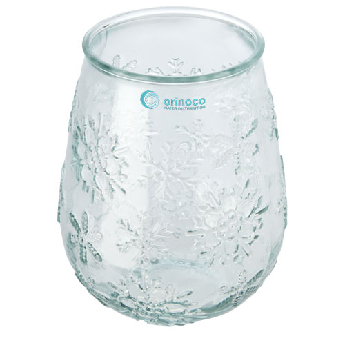 Theelichthouder van gerecycled glas met sneeuwvlokeffect. Gemaakt van 1 glazen fles. Gerecycled glas wordt geproduceerd met minder energie, grondstoffen en toevoegingen, dan wat nodig is voor het maken van traditioneel glas. Theelichtje niet inbegrepen.