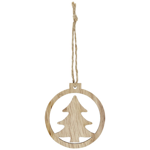 Houten ornament in ronde vorm met een boom erin. Voorzien van een hanger en een koord. Individueel verpakt met een kaart van kraftpapier aan de achterkant.