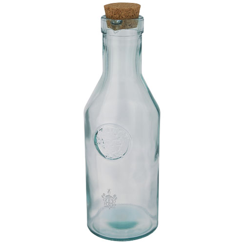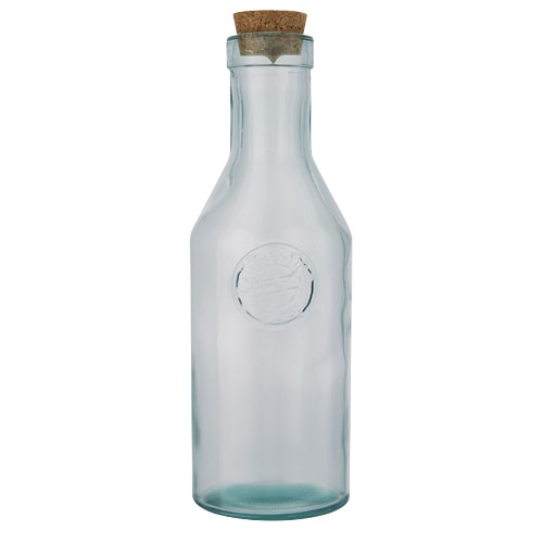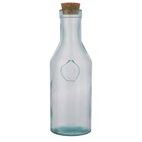 Glazen karaf van 1000 ml met kurken deksel, gemaakt van 100% gerecycled glas met exclusief design. Deze duurzame en trendy karaf is perfect voor het serveren van water, sap, olie of azijn. De karaf is gemaakt van gerecyclede glazen flessen. Gerecycled glas wordt geproduceerd met minder energie, grondstoffen en toevoegingen, dan wat nodig is voor het maken van traditioneel glas. De karaf is vaatwasmachinebestendig.