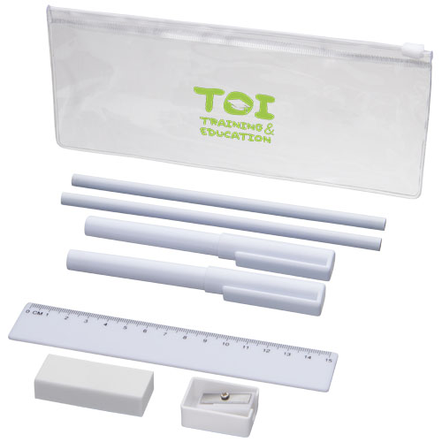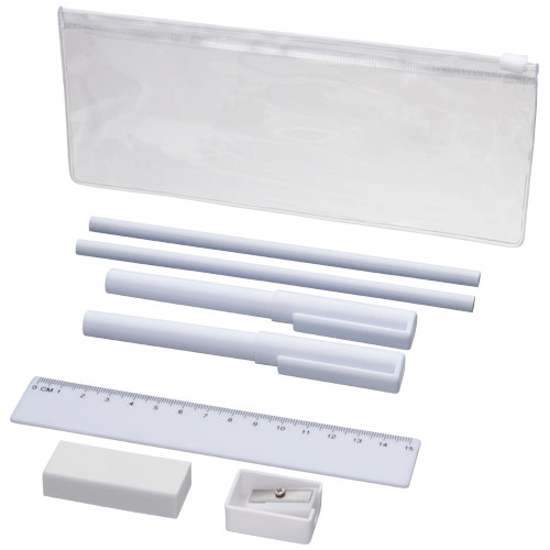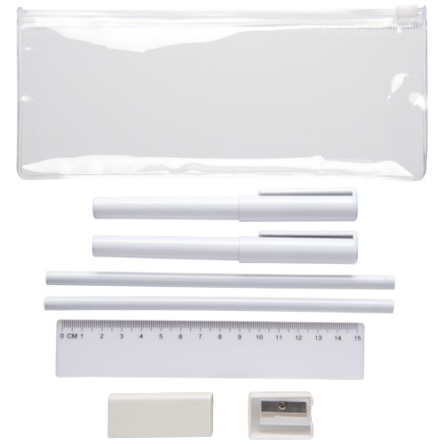 PVC pennenset met 2 balpennen (1 met zwarte inkt, de andere met blauw), 2 potloden, een liniaal, een puntenslijper en een gum.