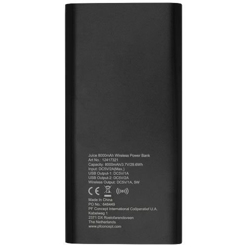 8000 mAh powerbank met aluminium behuizing. Ondersteunt 5 W draadloos opladen en wordt ook geleverd met Micro USB-uitgang om te kunnen opladen met een kabel. Met de lithiumpolymeerbatterij van 8000 mAh kan hij een smartphone meerdere keren volledig opladen. Powerindicator die te allen tijde het energieniveau weergeeft. Micro USB-ingang: 5 V/2 A-uitgang: 5 V/2A. Draadloze uitgang 5 W. Inclusief PVC-vrije TPE kunststof oplaadkabel. Geleverd in een standaardgeschenkverpakking.