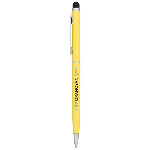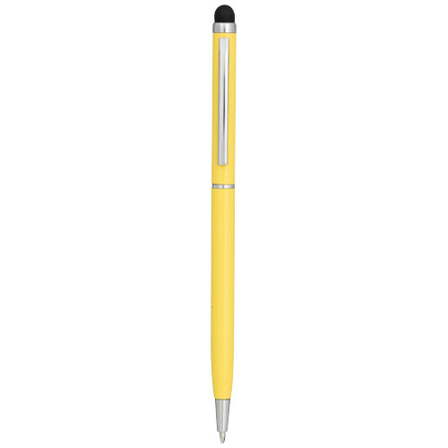 Slank vormgegeven balpen van aluminiumglazuur. Met draaimechanisme en stylus.